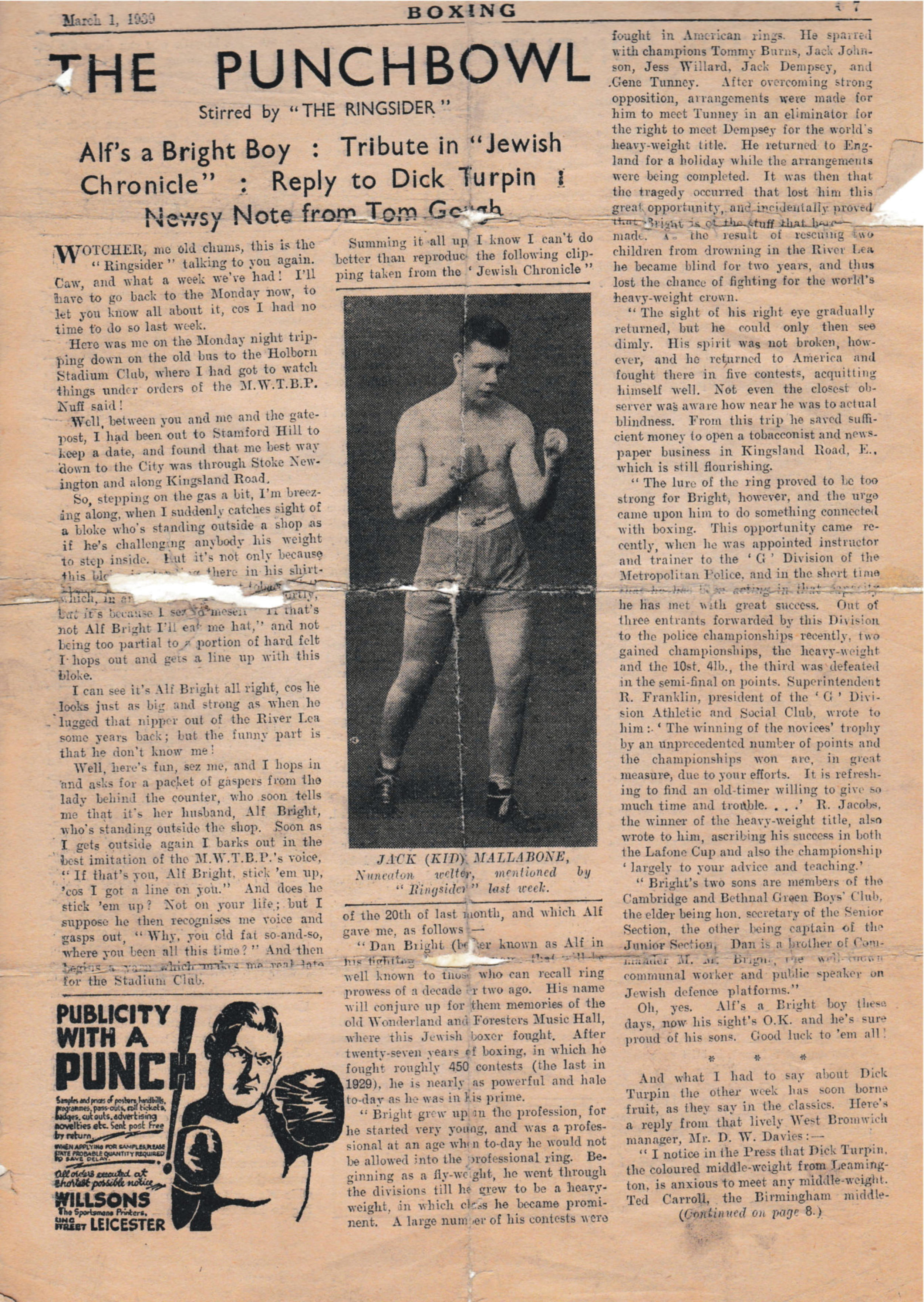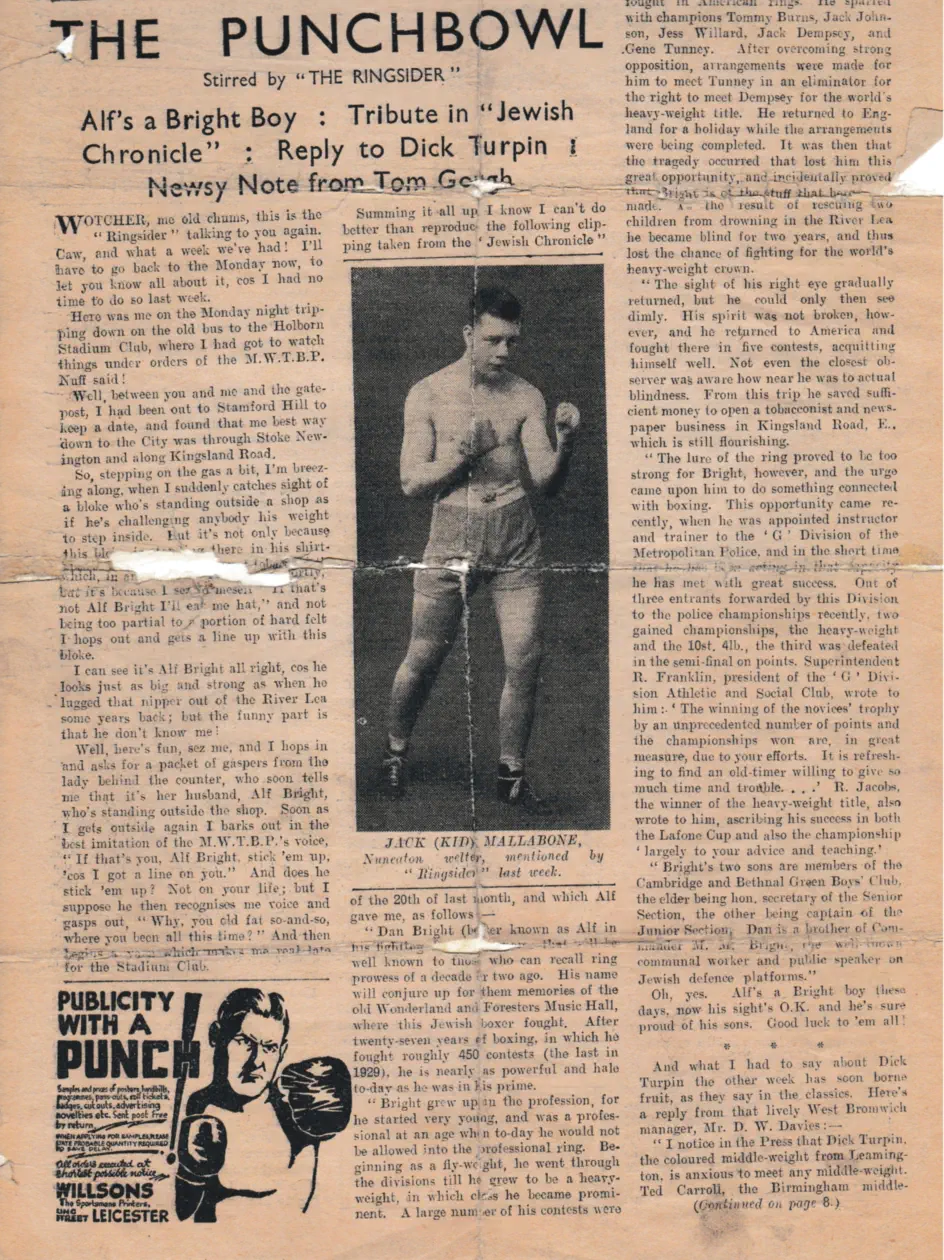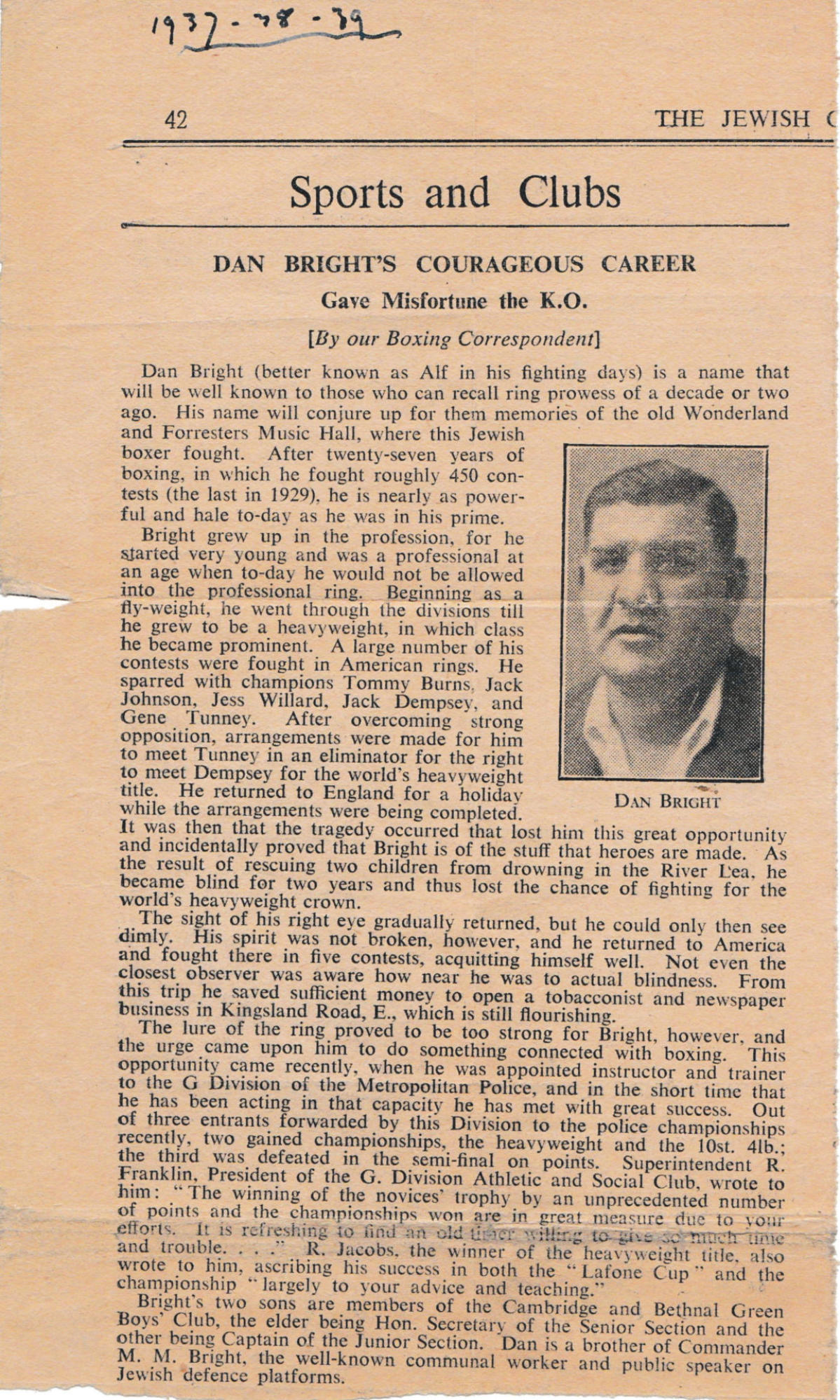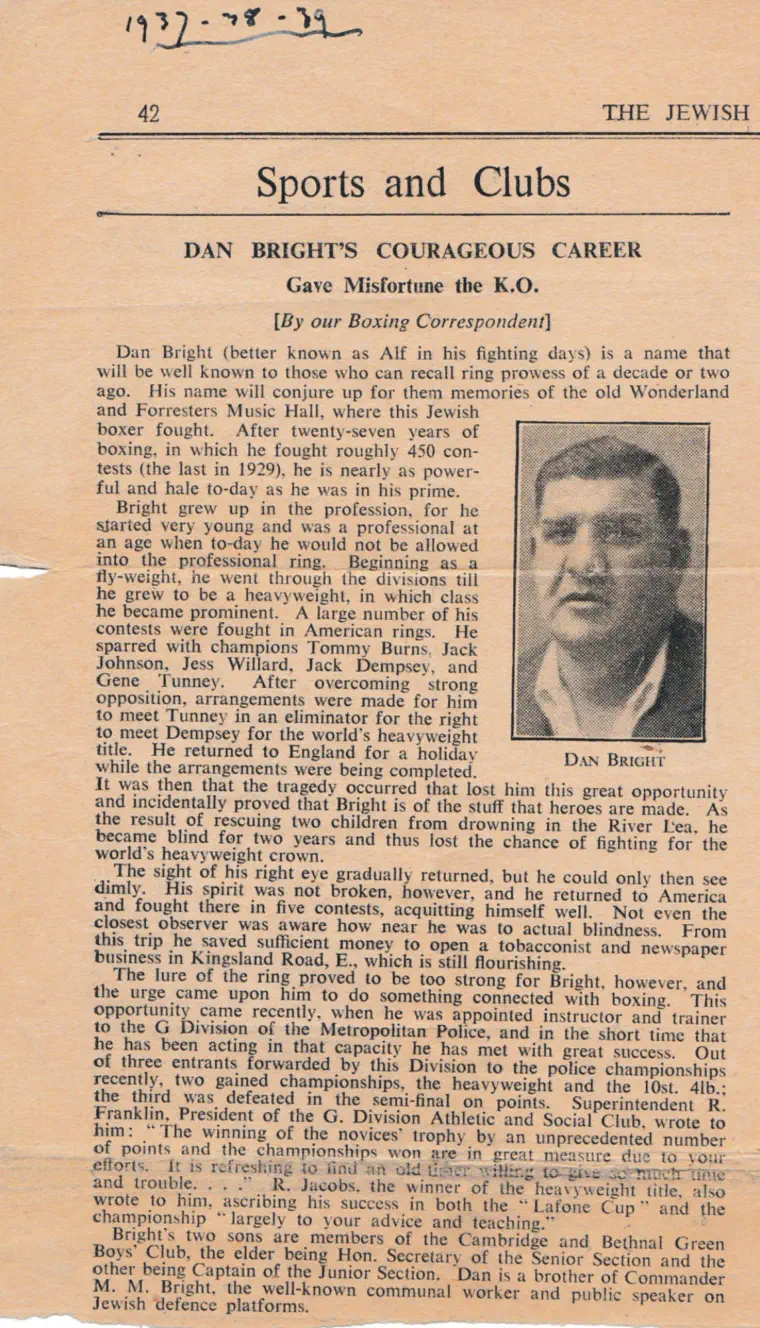 Daniel Bright was due to fight the great Gene Tunney this was an eliminator fight.