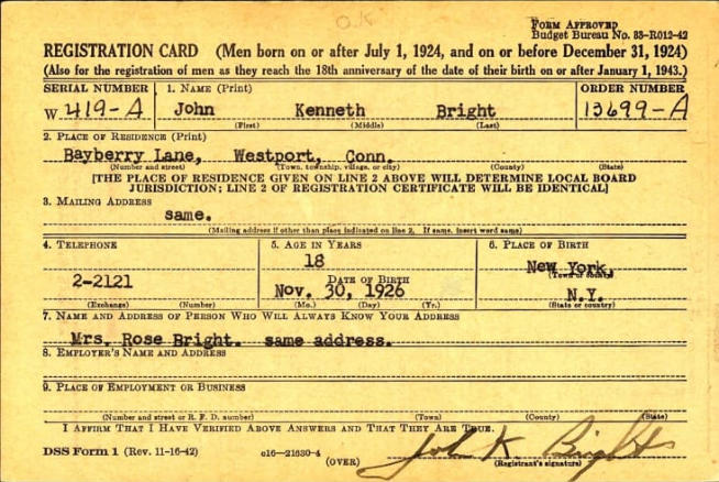 John K Bright US Army draft card